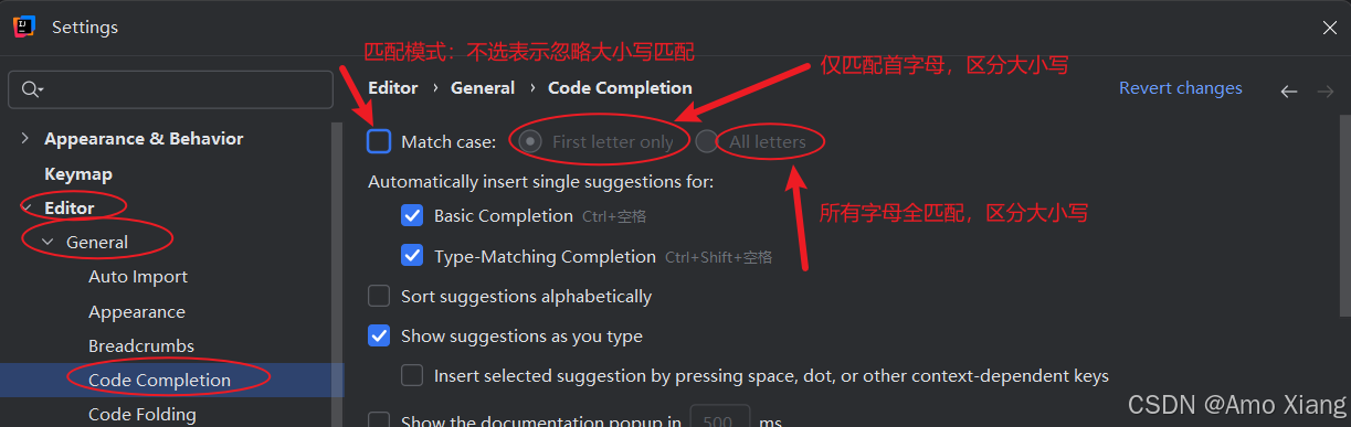 idea 有代码自动提示功能,这个功能非常好用,但默认是严格区分大小写的,可以设置忽略大小写自动提示。单击 "file"→"settings..."→"editor" → "general" → "code completion",然后取消 "match case" 前面的勾选,如下图所示: