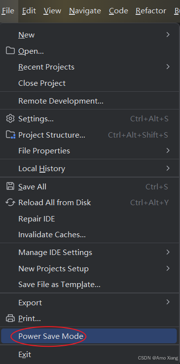 在使用 idea 的过程中,如果突然发现自动提示等功能不灵了,那么有可能是不小心勾选了节电模式。可以在 "file" 下检查是否勾选了 "power save mode",如果是,那么请去掉勾选,如下图所示,因为 idea 的自动提示等功能是要消耗系统资源的,所以当计算机电量不足,或者使用了节电模式时,idea 会牺牲自动提示等功能来减少电量的消耗。