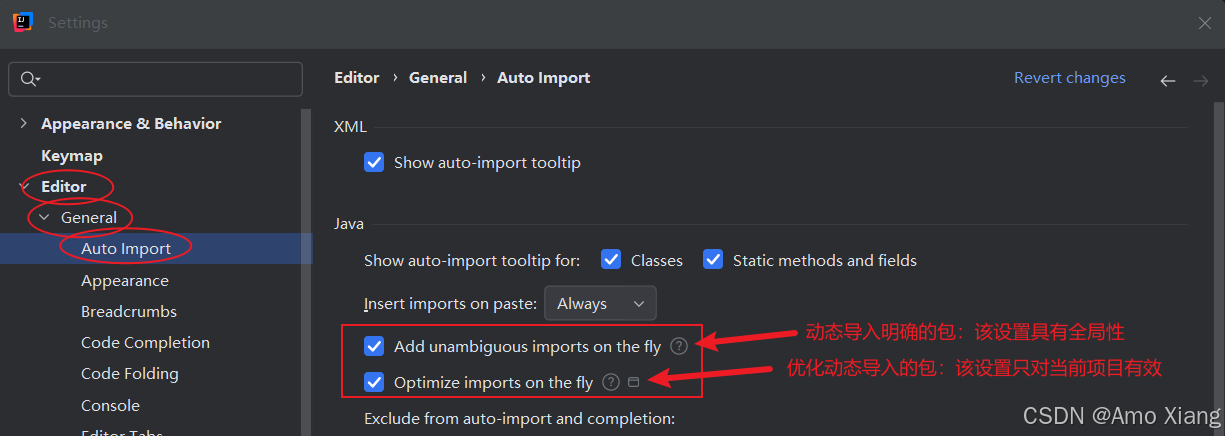 默认情况下,当使用非 java.lang 包的其他系统核心类时,需要手动导包。在 idea 中可以设置自动导包,设置后可以让开发更流畅和快速。如果遇到某个类在不同包出现重名时,idea 就无法确认要使用哪一个类,这时就仍然需要程序员进行手动确认。单击 "file"→"settings..."→"editor" → "general" → "auto import",勾选 "auto import" 下的两个复选框,如下图所示: