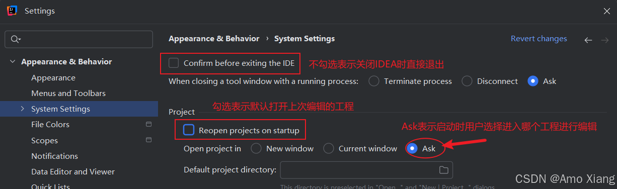 默认情况下,每次启动 idea 时都是默认打开上次编辑的工程,退出时需要确认是否真的退出 idea。如果想要启动 idea,由自己选择编辑哪个工程,那么也可以做相应的设置。单击 "file"→"settings..."→"appearance & behavior" → "system settings",如果想要默认进入上次编辑的工程,那么就勾选 "reopen projects on startup" 复选框,否则就取消勾选。如果当你单击 idea 的关闭按钮时想直接退出,那么就取消 "confirm before exiting the ide" 复选框的勾选,如下图所示: