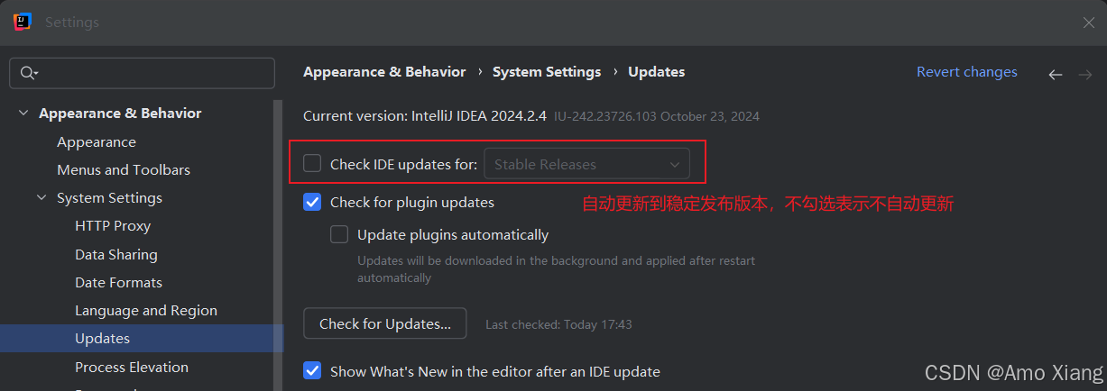 单击 "file"→"settings..."→"appearance & behavior" → "system settings" → "updates",取消勾选 "check ide updates for" 的复选框。