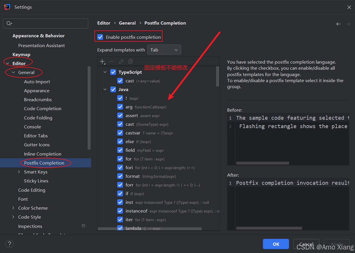 查看 idea 已有的代码模板单击 "file"→"settings..."→"editor" → "general" → "postfix completion",如下图所示: