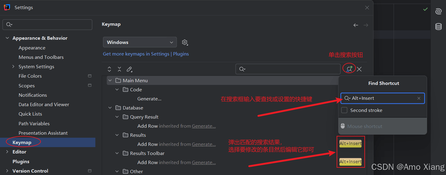 熟练掌握各种快捷键可以加快开发速度。idea 的快捷键有很多,可以单击 "file"→"settings..." → "keymap" 进行查找和修改对应的快捷键,如下图所示: