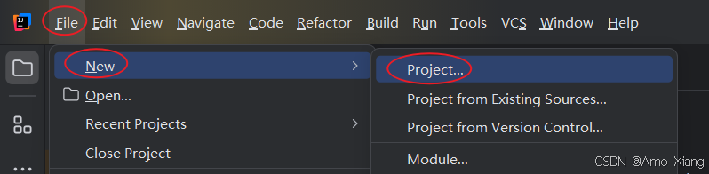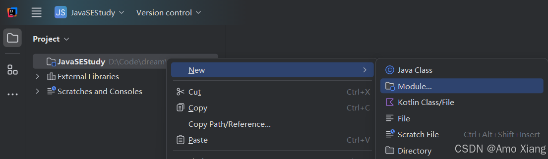 单独的空工程只是起到管理多个模块的作用,其下面没有 src 等结构。我们不在工程下直接编写代码,而是把代码放到一个一个模块中,所以必须再新建一个或多个模块才能正式开发,右键单击项目名称,然后 "new" → "module..." 创建模块,如下图所示: