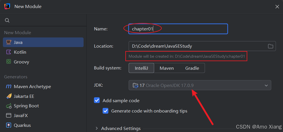这里的一个模块其实也相当于一个小的工程,可以独立运行,因此也需要指定模块的类型和 sdk 运行环境,如下图所示: