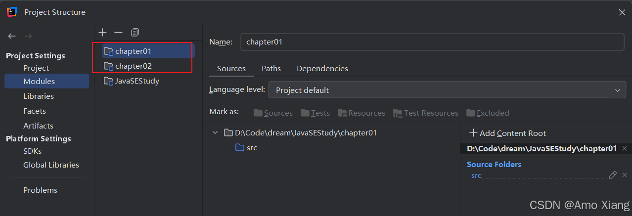 例如,刚才空工程的路径是 "d:\code\dream\javasestudy\",现在新建模块的 location 设置为 "d:\code\dream\javasestudy\chapter01",即在工程的路径下增加了一级 "chapter01"。此时 "module name" 自动为 "chapter06","module file location" 的文件路径自动修改为 "d:\code\dream\javasestudy\chapter01",单击 "create" 按钮就表示模块创建完成。模块创建完成后,可以通过鼠标右键单击项目名称,然后 "open module settings" 查看所有模块,如下图所示: