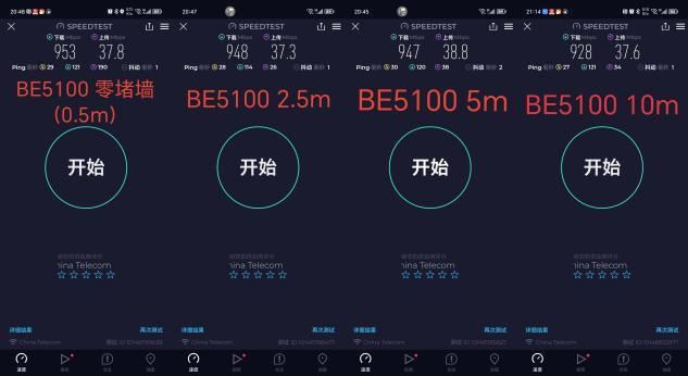 不同距离的无线网速如下图,最高953mbps,十米后为928mbps,仅下降25mbps,下降幅度仅为2.6%。对于家庭用户来说,巡天be5100在物理距离上仅有轻微下降。
