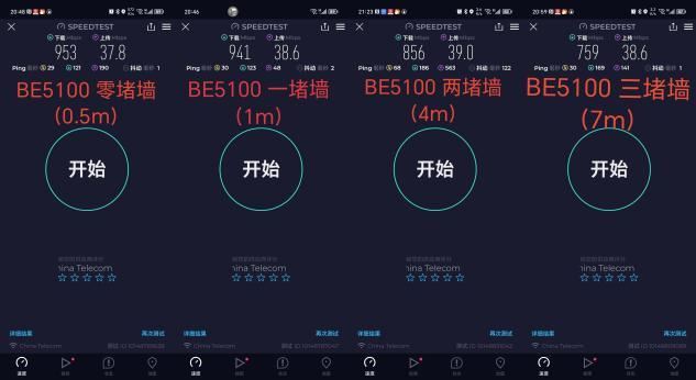 不同穿墙后的无线网速如下图,最高951mbps,穿两堵墙(4m)后为924mbps,下降幅度仅为2.8%,信号下降微乎其微;三堵墙(7m)后为827mbps,仅下降124mbps,下降幅度为13%,也比较小。信号穿墙能力,问天be7200pro+表现值得点一个大大的赞。对于一个普通三四居的家庭用户来说,一台问天be7200pro+即可满足全屋wifi需求。