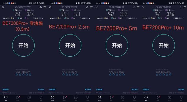 不同距离的无线网速如下图,最高951mbps,十米后为941mbps,仅下降10mbps,下降幅度仅为1%。对于家庭用户来说,问天be7200pro+在物理距离上可以认为几乎不下降。