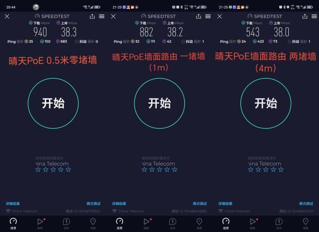 墙面路由多为一拖二或一拖三模式,母路由位于弱电箱内,子路由通过全屋有线连接可组成一个wifi网,因此一般物理距离和穿墙数都会比常规路由要少。因此,仅测试5m内和穿两堵墙后的信号情况。