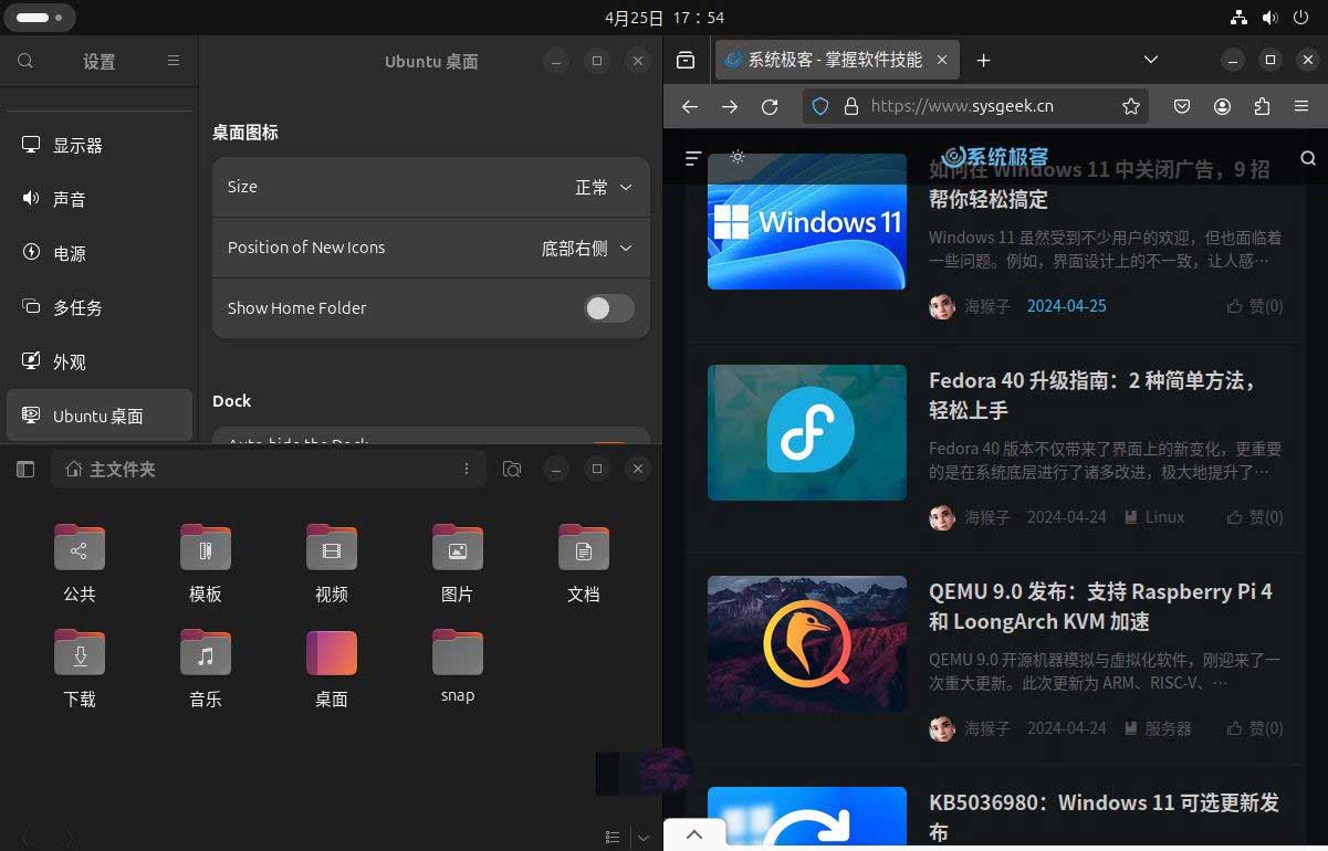 - 「设置」中新增了「ubuntu 桌面」菜单,提供了多个新选项以优化窗口平铺体验,包括原生支持 1/4 窗口平铺。