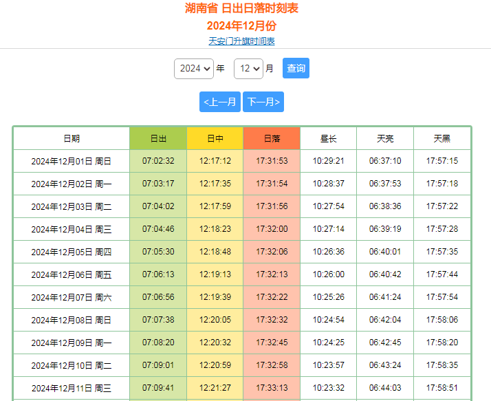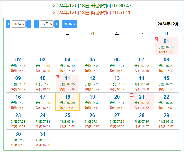 众所周知,天安门广场国旗升降的具体时间根据北京的日出日落时间来确定的,由北京天文台天文学家林亨专门计算的。因此如果你也想去天安门看一场升旗仪式,请一定要看好时间,同时定好闹钟,否则就会错误哦。这里以2024年12月的天安门升旗仪式的一个web应用为例,就很清晰的描述了12月的升旗日历,升国旗日历。