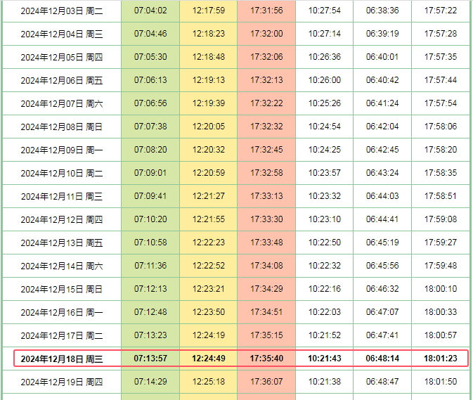 通过这个日历就可以看到在12月中每一天的日出和日落时间,作为北半球的城市,太阳现在离北回归线越来越远,这是初中的地理知识。当到了冬至日后,日出的时间就会变早,而日落的时间就会变迟。
