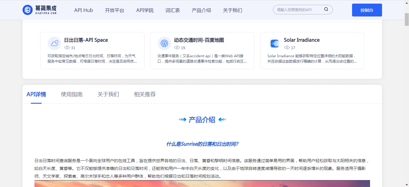 如果没有编程能力,那么可以选用在线api,可以在互联网上搜索一些在线的api来进行接口调用。当然,取决于不同的接口服务商,他们会在接口那收取一定的费用,或者调用的时候有一定的延时。这里分享一个在线的日出日落计算api。