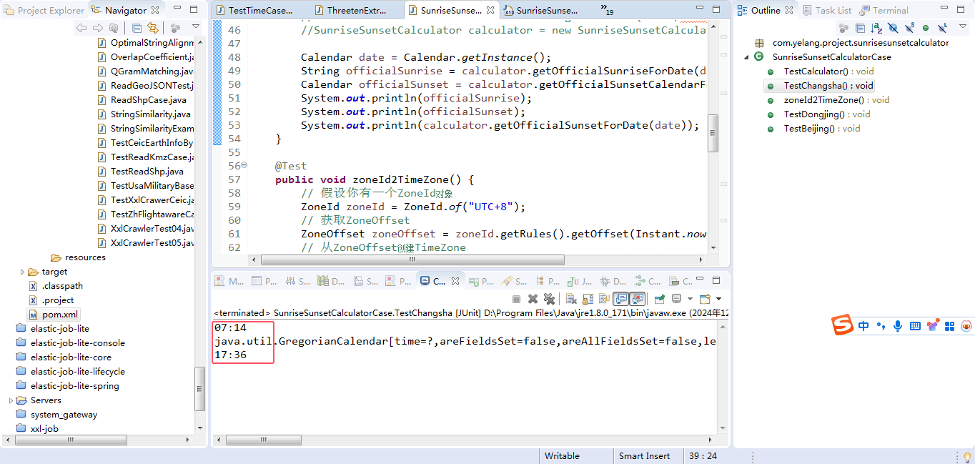 }首先需要根据长沙的经纬度来进行创建位置对象。然后创建sunrisesunsetcalculator对象,在构造对象的过程中,传入位置和时区信息。关于时区信息,可以通过之前的系列博客介绍来进行获取。传入时区是为了更好的生成本地时间对应的日出和日落时间。在控制台中运行以上代码后,可以看到以下的信息输出。