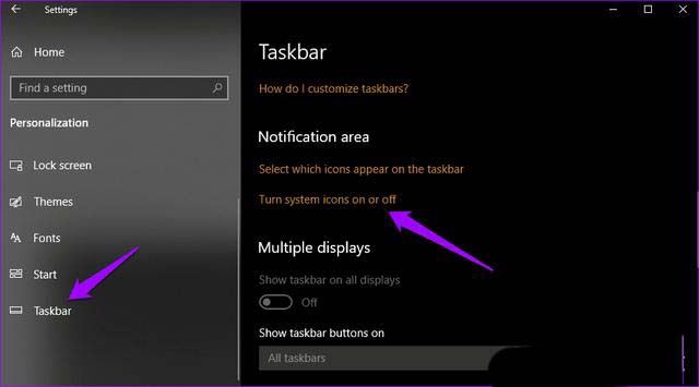 单击左侧窗格中的任务栏,然后在右侧的通知区域下选择打开或关闭系统图标。