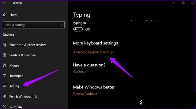 2、在左侧窗格中选择“输入”,向下滚动以在“更多键盘设置”下找到“高级键盘设置”,然后单击它。