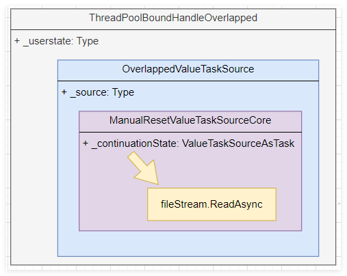 readasync 所产生的 task<int> 在底层是经过valuetask, overlappedvaluetasksource 一阵痉挛后弄出来的,最后会藏匿在 overlapped 子类的 threadpoolboundhandleoverlapped 中,参考代码和模型图如下: