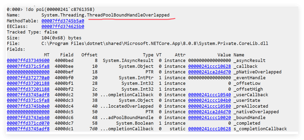 根据上面的模型图,00000241ca2d4d90 保存的是引用计数,00000241c8761358 就是我们的 threadpoolboundhandleoverlapped ,可以 !do 它一下便知。
