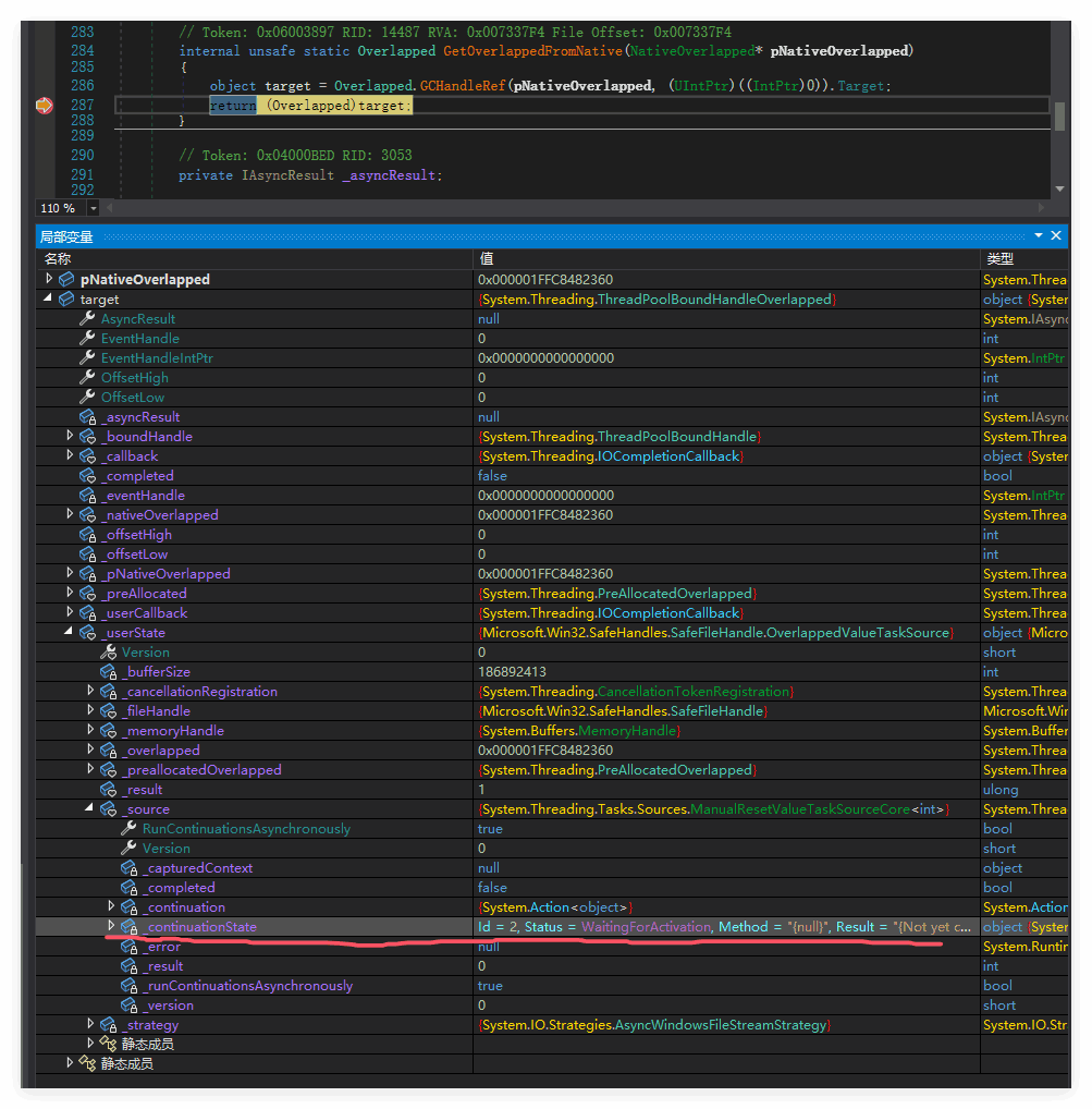 最后用 dnspy 在 overlapped.getoverlappedfromnative 方法中下一个断点,这个方法会在异步处理完成后,执行nativeoverlapped寻址threadpoolboundhandleoverlapped 的逻辑,截图如下,那个 readasync保存在内部的 _continuationstate 字段里。