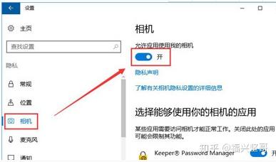 2、在左侧点击【相机】,在右侧将有关相机的开关全部度开启即可。
