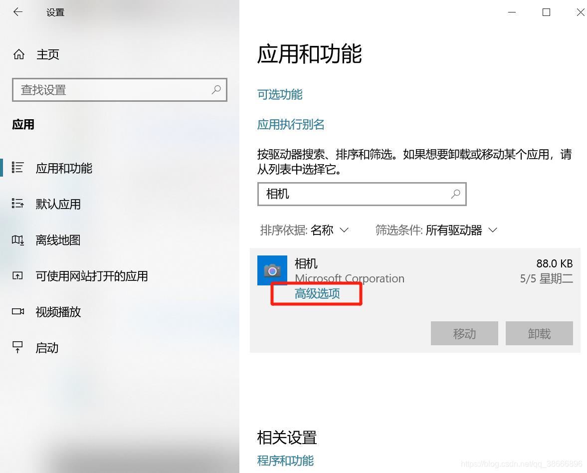 在设置>>系统>>应用和功能,找到并点击相机应用,选择并点击“高级选项”,在高级选项中重置相机应用。并且重启电脑才生效
