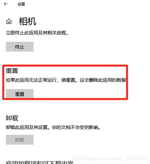 2. 找到相机应用展开点击“高级选项”,在高级选项中选择重置应用,然后重启电脑(重要!)