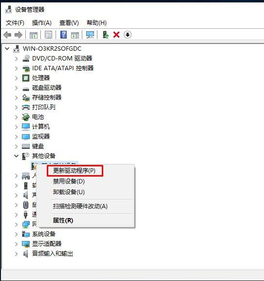 3、如果没有发现照相机,而是有未知设备的话,右键点击更新驱动;