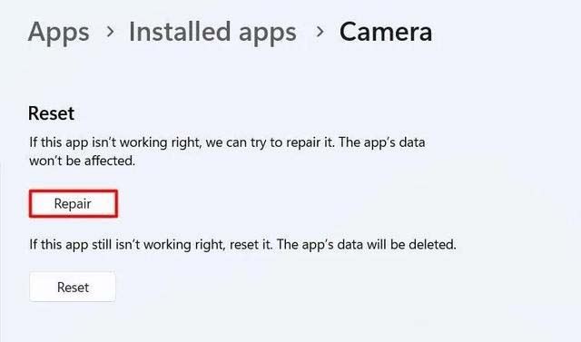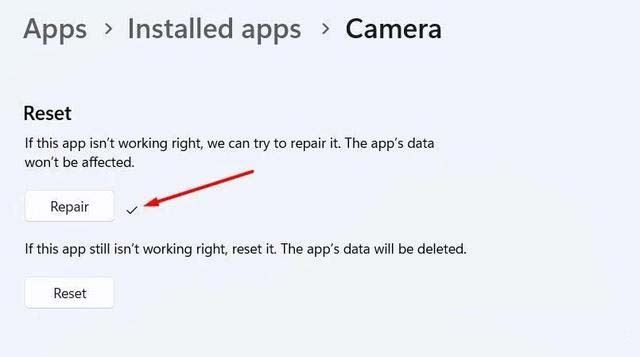 windows将尝试修复该应用程序。修理过程完成后,“修理”按钮旁边将显示一个复选标记。随后,启动相机应用程序并检查其是否正常工作。如果你仍然遇到错误消息,则需要重置相机应用程序。