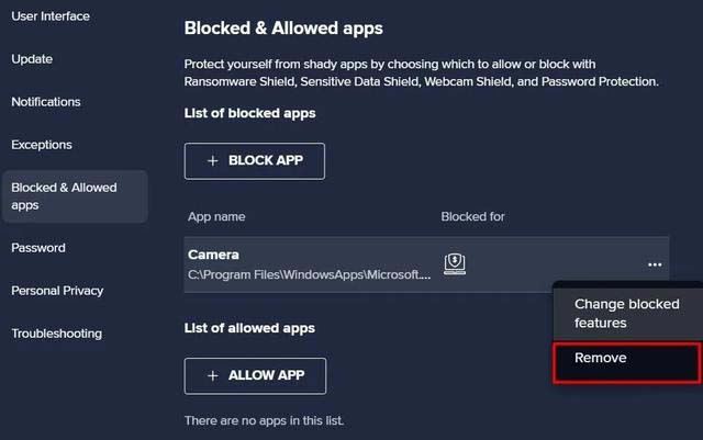 检查windows相机应用程序是否在阻止的应用程序列表中。如果是,请单击应用程序旁边的三个点,然后选择“删除”选项。