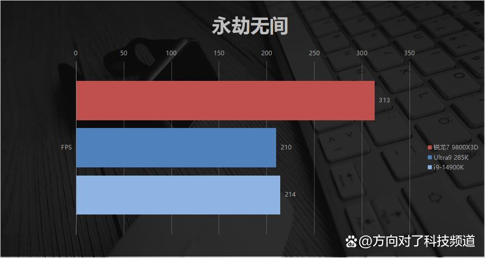 《永劫无间》实测中,锐龙7 9800x3d平均fps为313,ultra9 285k为210,14900k为214。与较强一些的14900k对比,锐龙7 9800x3d依然有46%的领先。