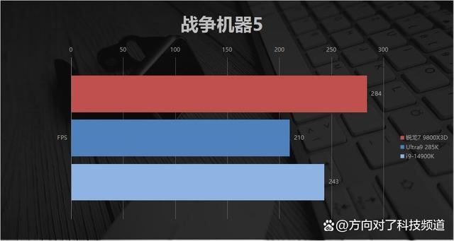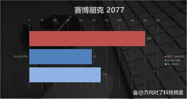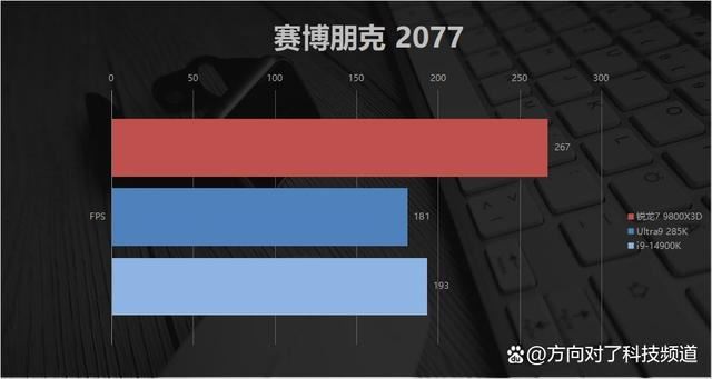 先来看《赛博朋克2077》,锐龙7 9800x3d的平均fps为267,ultra9 285k为181,14900k为193。原以为单机游戏场景下,三者帧率差距会被缩小一些,没想到锐龙7 9800x3d依然可以领先14900k接近28%。