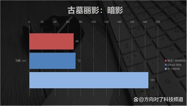再来看游戏场景下的功耗表现,可以看到锐龙7 9800x3d的功耗是略低于以低功耗见长的ultra9 285k的,功耗还不到“一飞冲天”的14900k的零头。也就是说,实际游戏场景中,它给到的供电和散热压力,甚至是低于三款中游戏性能最差的ultra9 285k的。