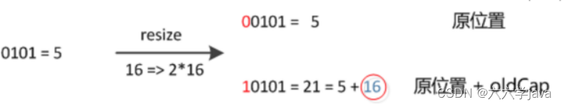 而元素在重新计算hash之后,因为n变为2倍,那么n-1的mask范围在高位多1bit(红色) ,因此新的index就会发生这样的变化: