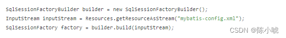 上述代码中,我们首先创建了一个 sqlsessionfactorybuilder 对象 builder,然后通过 resources.getresourceasstream() 方法获取了 mybatis-config.xml 文件的输入流 inputstream。最后,我们通过 builder.build(inputstream) 方法创建了一个 sqlsessionfactory 实例 factory。