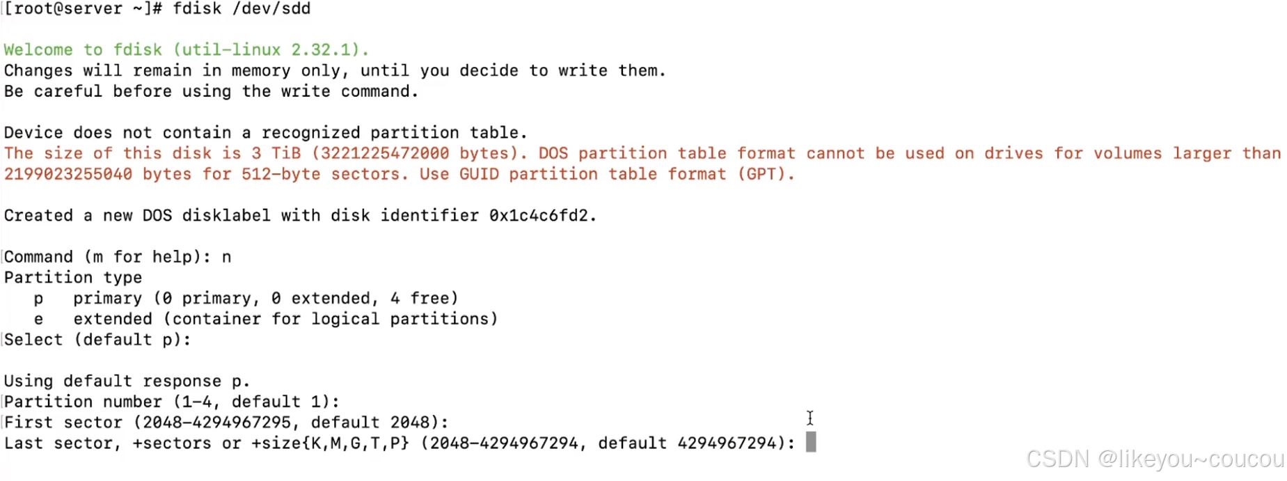 如果想采用mbr(master boot record)的方式进行分区就使用fdisk命令