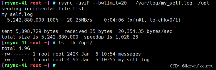 [rsync-41 root ~] # rsync -avzp --bwlimit=20 /var/log/my_self.log /opt