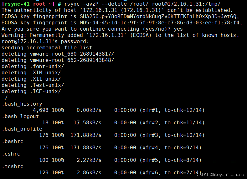 # push 推送模式,上传模式 把rsync-41 /root下的数据,拷贝到 nfs-31 /tmp下 登录rsync41 用ip形式、再用主机名形式 添加无差异化参数,该参数,慎用!搞清楚了自己在做什么! rsync -avzp --delete /root/ root@172.16.1.31:/tmp/
