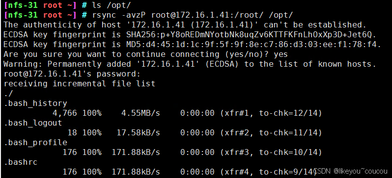 # pull 拉取模式(需要确定,数据最终放在了哪) # 把rsync-41 /root下的数据,拷贝到 nfs-31 /tmp下 rsync -avzp root@172.16.1.41:/root/ /tmp/