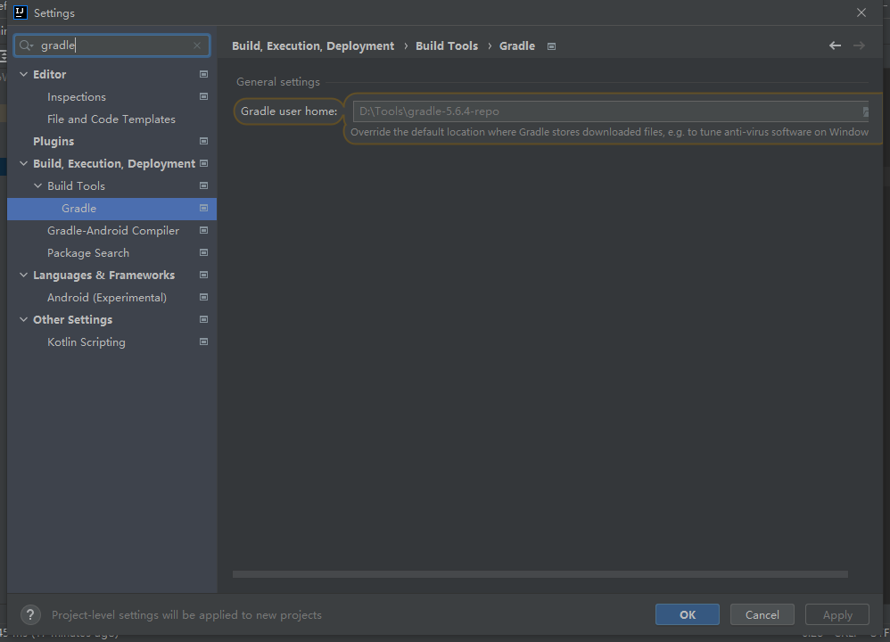 file=》new project setup=》settings for new projects=》搜索gradle=》如下图设置自己的gradle仓库路径=》apply=》ok
