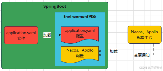 1、springboot配置文件和springcloud配置中心中的配置,区别只是来源不同,都是被读取加载到environment对象中生效的: