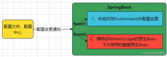 原理:使用@refreshscope标记的bean,spring会为其创建代理对象,代理对象中持有原生对象,@value的属性值位于原生对象中。springboot中的配置中心客户端在收到服务端的变更通知后,会先后发布两个事件:1、触发environment重新加载相关配置数据。2、触发所有@refreshscope的bean置为null,则在这些bean下次使用时重新创建,重新从environment中获取配置,即实现@value属性值的更新。