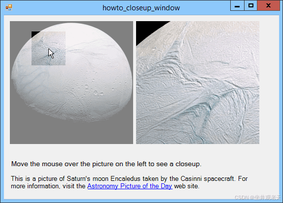 许多网站都会显示一个特写窗口,其中显示放大的图像部分,以便您可以看到更多细节。您在主图像上移动鼠标,它会在单独的图片中显示特写。此示例执行的操作类似。(示例使用的一些数学运算非常棘手,因此您可能需要仔细查看才能了解其工作原理。)