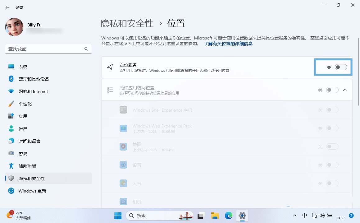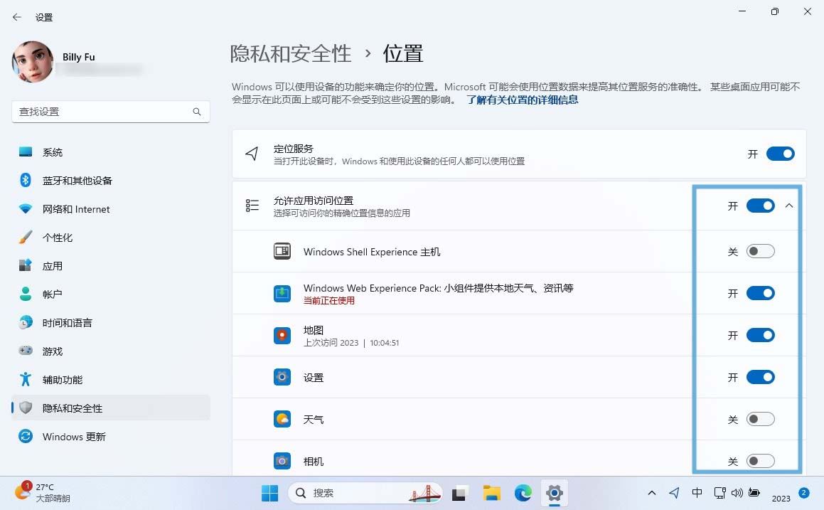 3、通过「允许应用访问位置」开关,可以启用或禁用 windows 11 中所有 uwp 应用程序的位置跟踪。