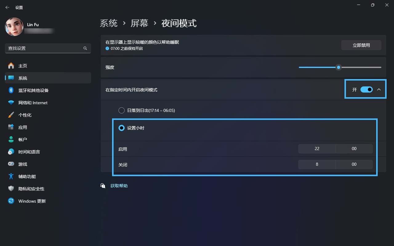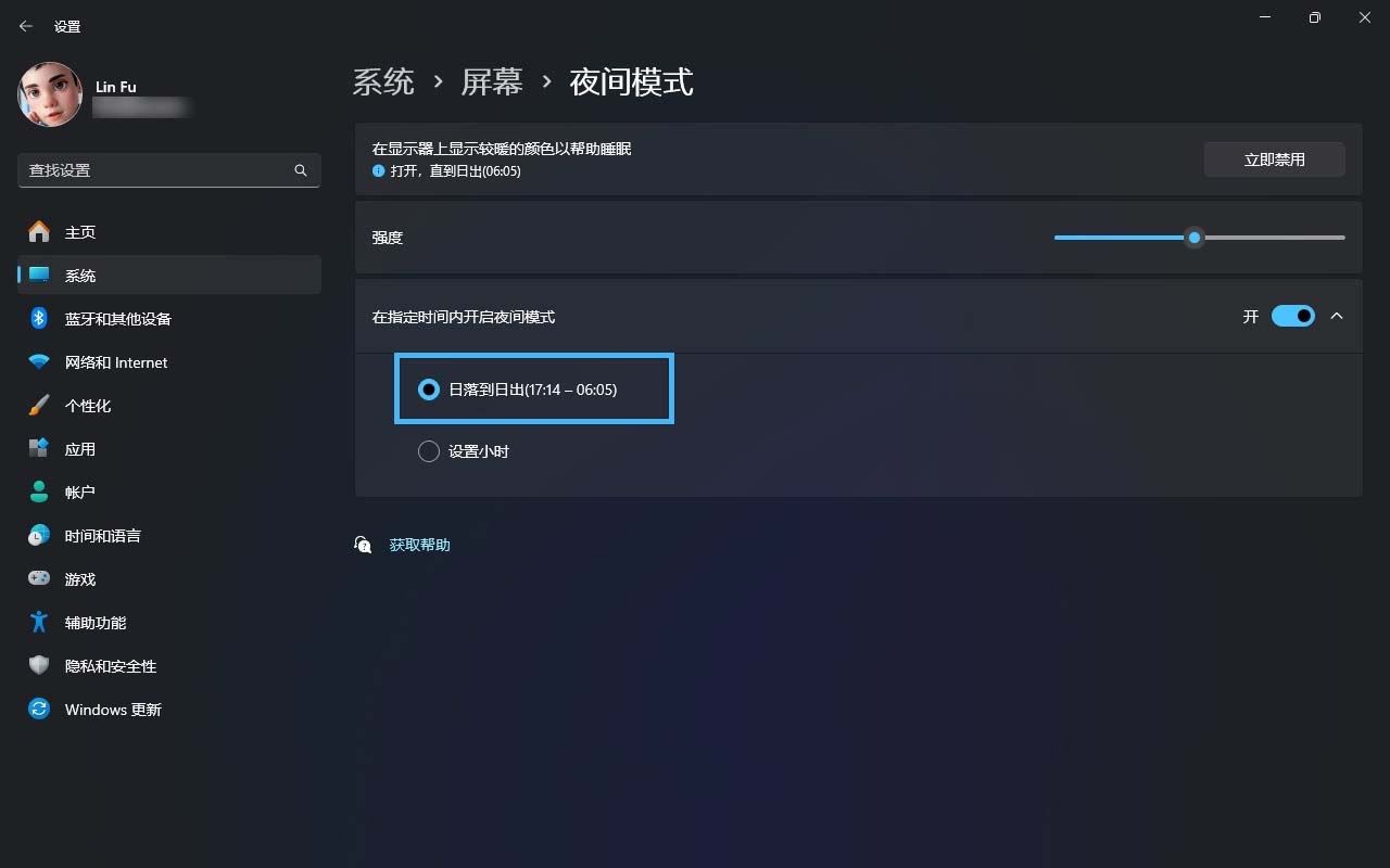 - 通过「日落到日出」选项,使用 windows 11 定位服务,自动在日落时开启,日出后关闭。