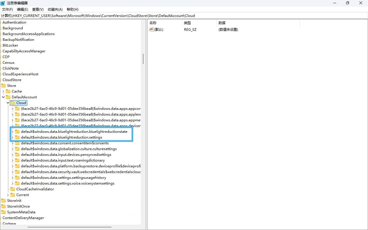 3、删除名为default$windows.data.bluelightreduction.bluelightreductionstate和default$windows.data.bluelightreduction.settings的注册表键。