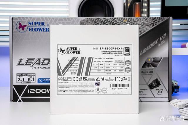 底部电源铭牌,支持100~240v宽幅电压输出,12v输出最大电流99.9a,1200w的总输出功率,可以满足rtx 5090显卡搭配旗舰级处理器的供电需求。5v和3.3v输出20a,两路联合输出最高100w,另外+5v待机输出为2.5a 15w。