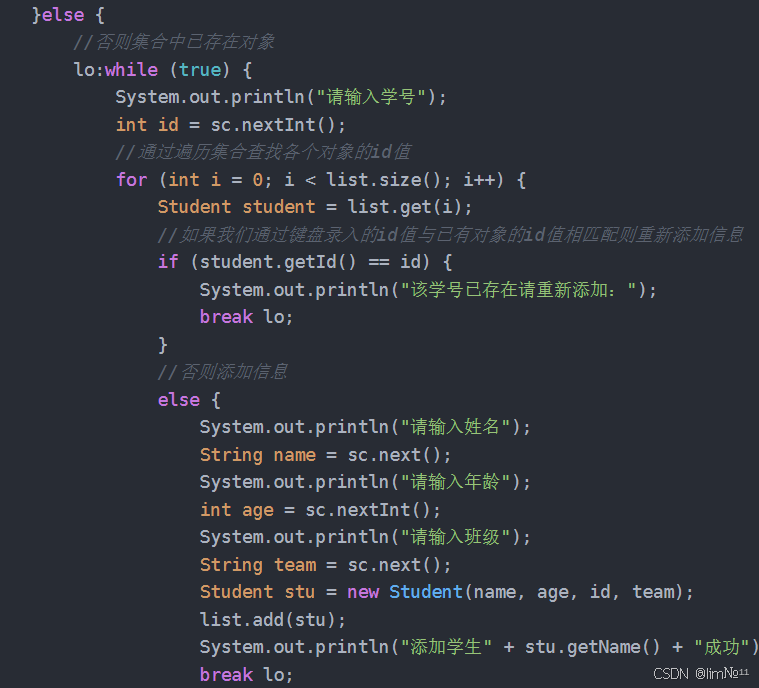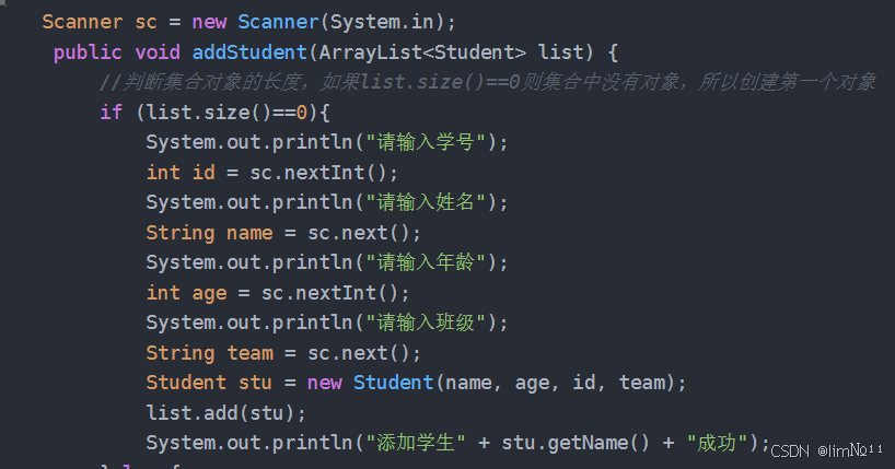 首先通过 list.size()==0 判断我们是否是存入第一个学生对象,因为我们学生学号通常是唯一的,而名字,年龄,班级不是唯一的,可以同名等。而我们存入的第一个学生对象是不存在学号重复的问题。所以第一个学生对象则用键盘录入信息传入 stu 对象,再将stu对象添加到我们的list集合中