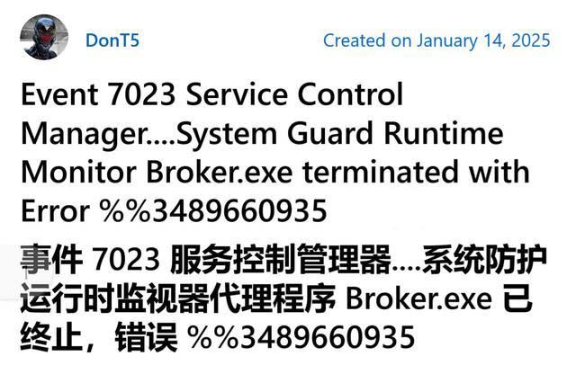 microsoft answers 论坛和 reddit.com 上,用户也确认了该问题。事件查看器中显示事件 id 7023,错误信息为“system guard runtime monitor broker 服务因下列错误而终止: %%3489660935”,hp omen 台式机和 hp envy 笔记本电脑(windows 10 22h2)均受影响。
