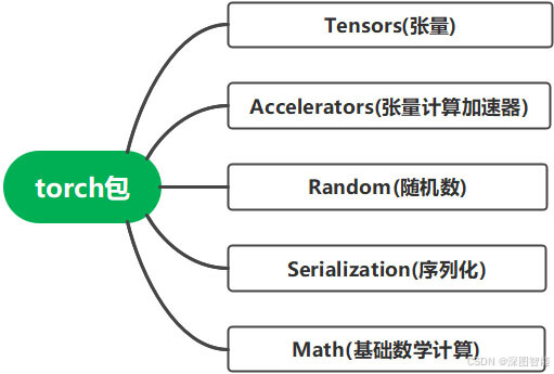 torch包是pytorch框架最外层的包,主要是包含了张量的创建和基本操作、随机数生成器、序列化、局部梯度操作的上下文管理器等等,内容很多。我们基础学习的时候,只有关注张量的创建、序列化,随机数、张量的数学数学计算等常用的点即可。
